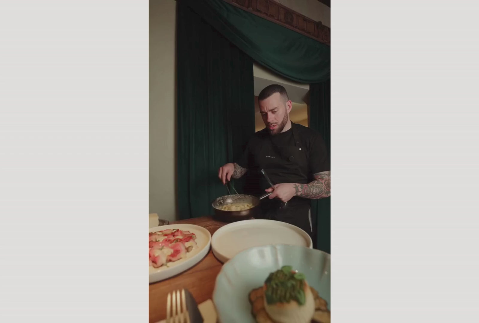 Immer eine halbe Stunde vor jedem Service oder Event berühre ich gerne die Produkte, rieche an den Soßen und verbinde mich mit dem, was ich kochen werde. Das ist meine Art, mich zu konzentrieren und meinen Geist vorzubereiten. Und natürlich darf ein italienischer Espresso vor dem Start nie fehlen. Dieser Moment der Stille und Konzentration verbindet mich mit meinem Team: Wir reden, machen ein kurzes Briefing, schauen uns an und wissen genau, was wir zu tun haben. Es ist ein Ritual, das mich schon immer begleitet.